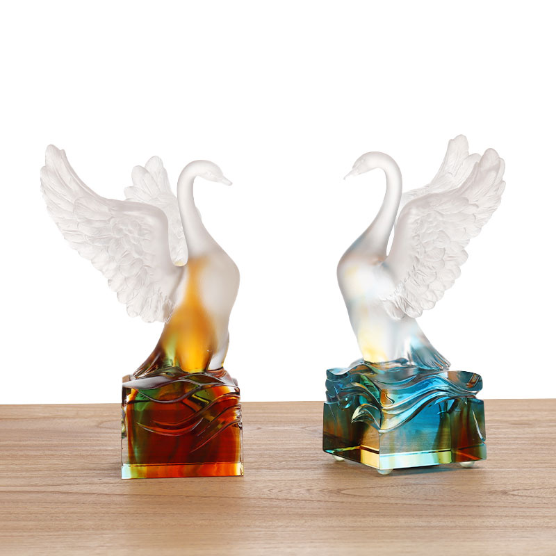 色に関しては、ガラスの白鳥は、頭の白から体のオレンジがかった黄色、そしてベースの濃い赤に徐々に移行するグラデーションカラーデザインを採用しています。この色の変化は、視覚的な層を増やすだけでなく、白鳥に暖かく厳粛な気質も与えます。