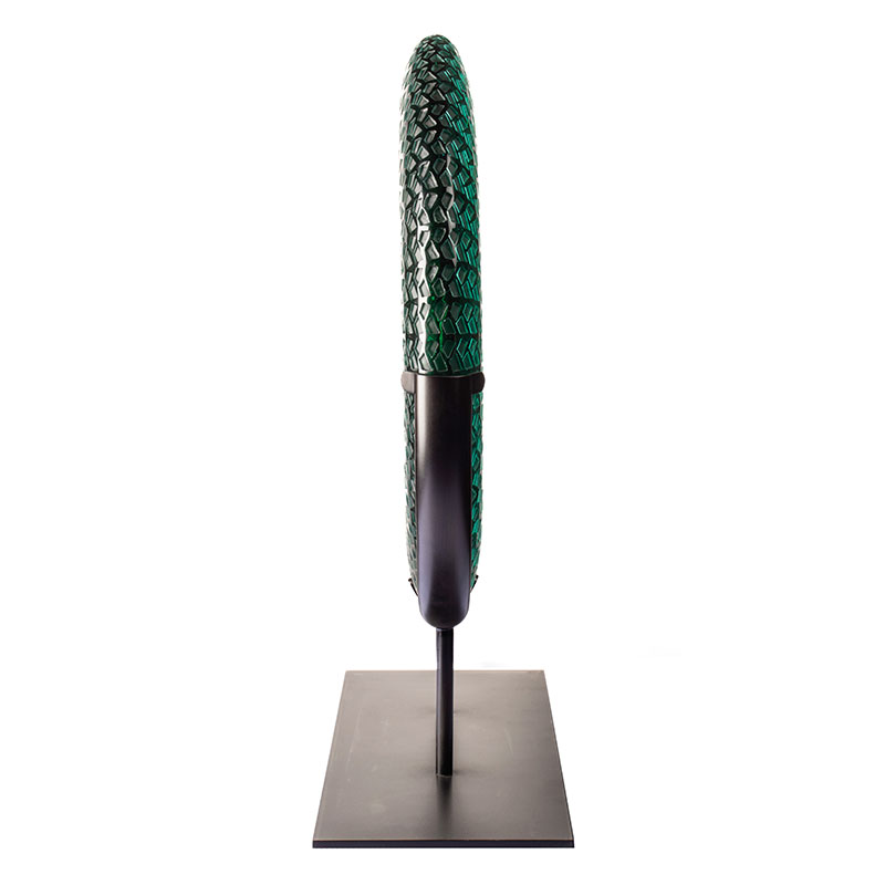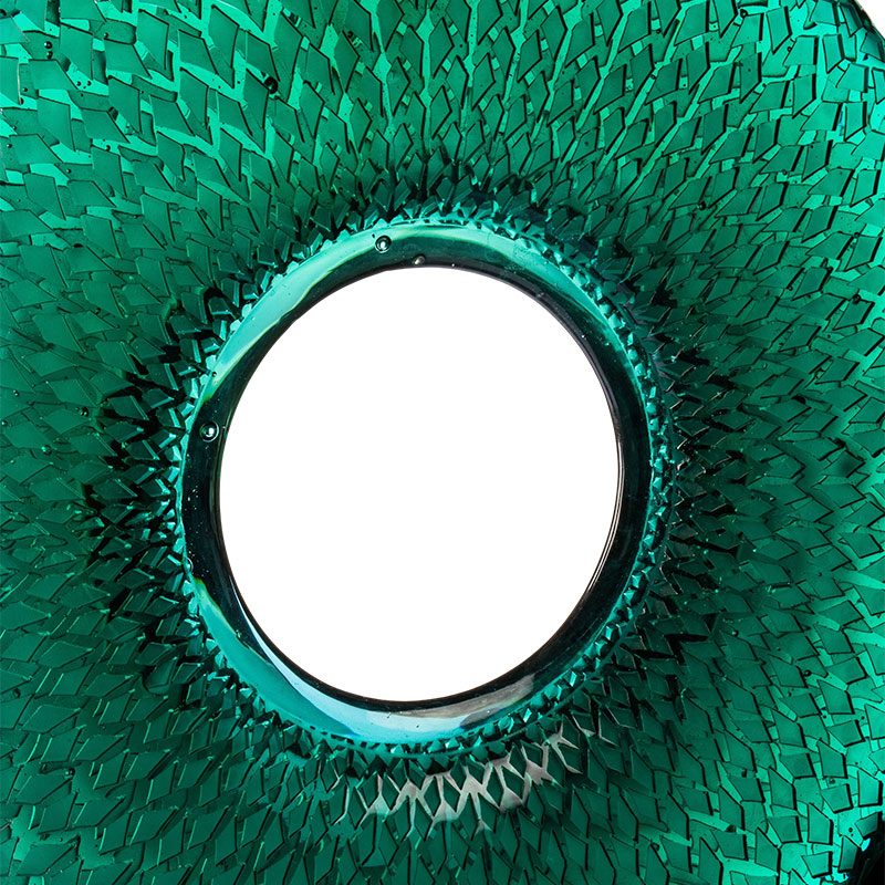 この作品は竹の葉を自然のインスピレーションとして取り入れており、森のそよ風に揺れる緑豊かな竹の幻想的な精神を捉えています。ガラスの半透明を通して、竹の千ものきらめく反射を思い起こさせます。その緑豊かな青は、朝露が蒸発する前の竹林の清々しさと、時の流れの穏やかな優雅さを表しています。広がる竹の葉脈のような複雑な模様が、表面を踊りながら光の層で波紋を広げ、円形のフレームの中に野生の山の精神を閉じ込めます。