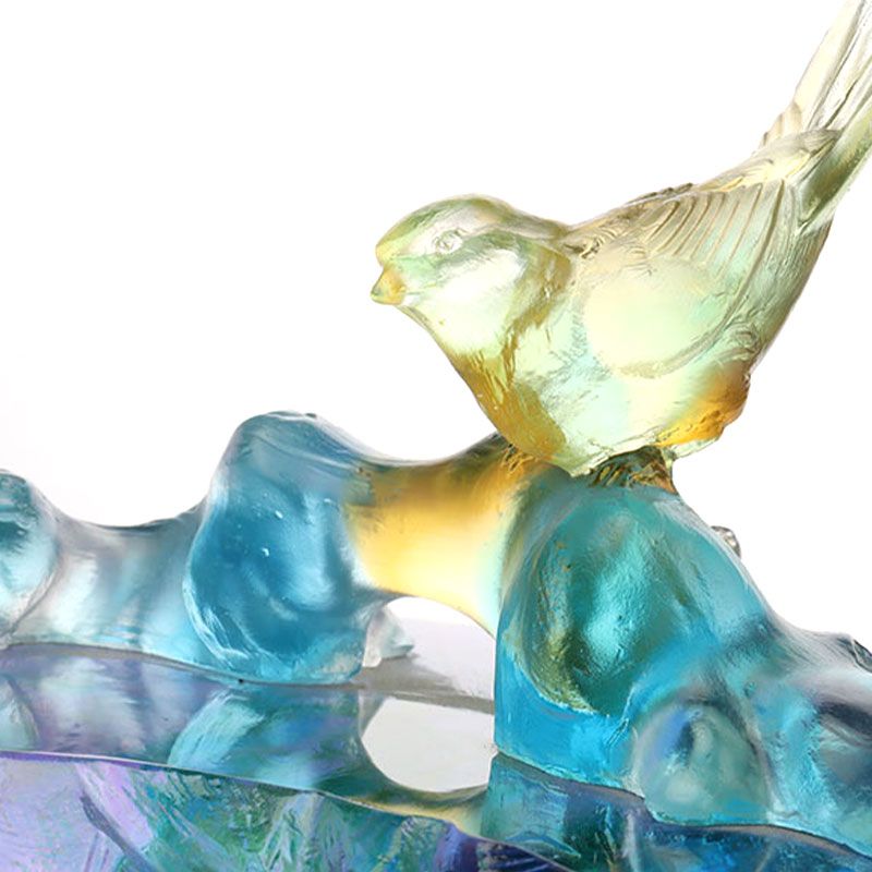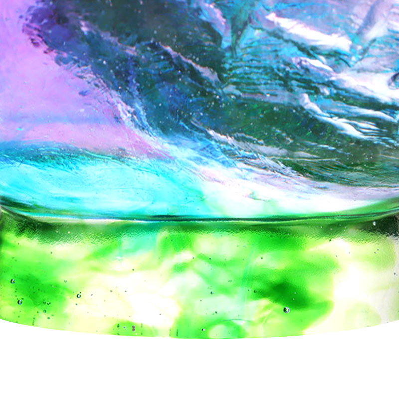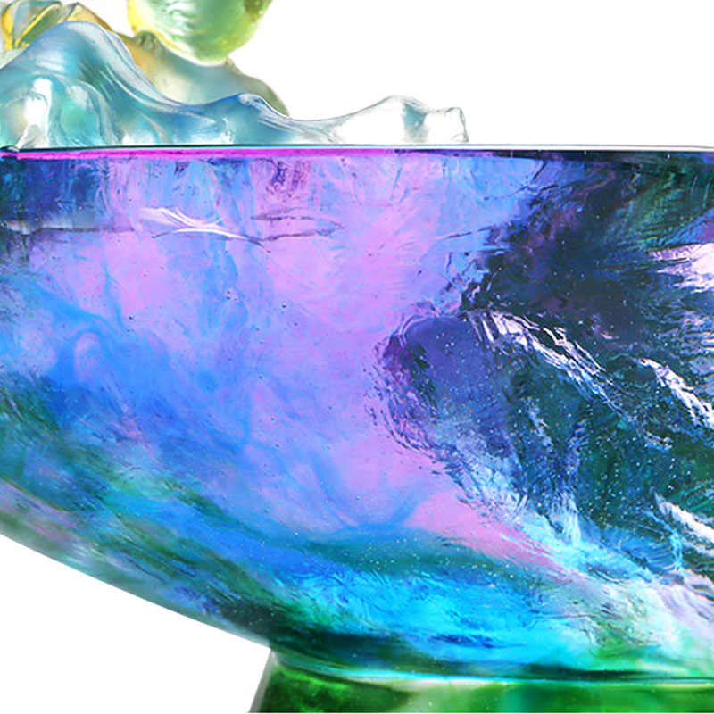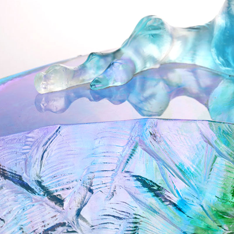 実は、ガラス作品に気泡が入っているのはごく普通のことです。これはロストワックス鋳造技術を使用しているためであり、その結果、作品内に自然に気泡が存在します。この内部の気泡を通して光が屈折する様子が、ガラス素材の独特の魅力を表しています。ガラスがまさに光の器として機能することを美しく示しています。